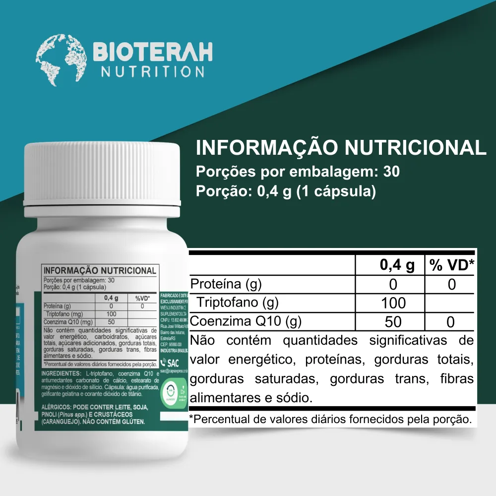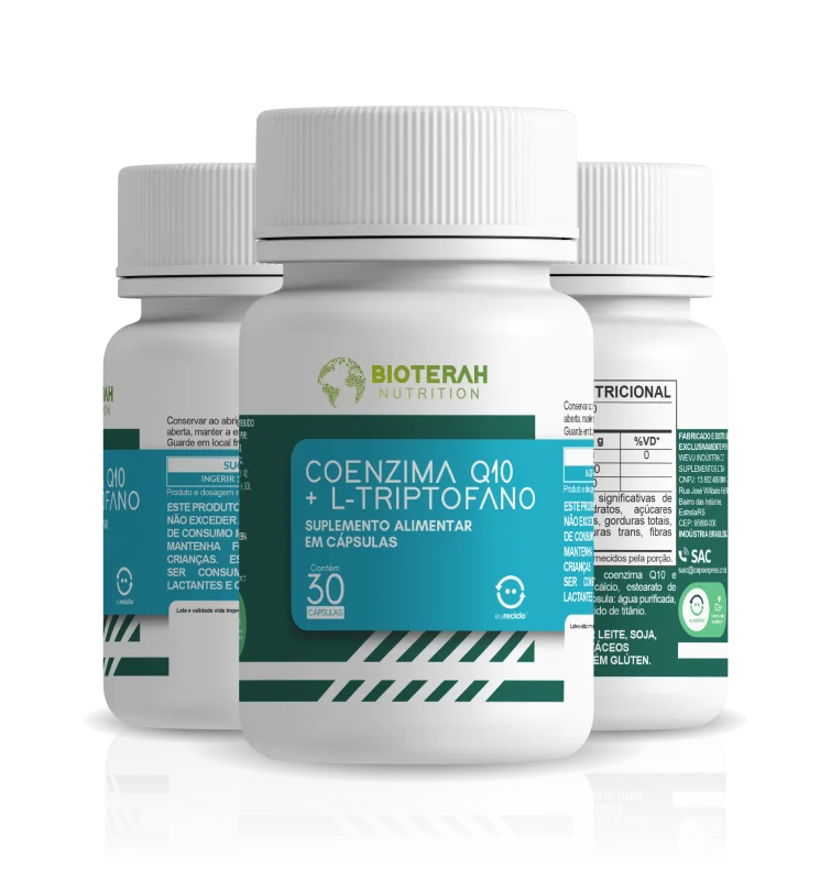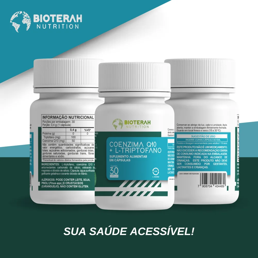 Produzido no mais alto nível de qualidade, o suplemento de Coenzima CoQ10 + L-Triptofano da Bioterah oferece uma combinação que melhora por completo o bem-estar geral e promove mais saúde mental. A CoQ10 é essencial para a produção de energia nas células, o que contribui para maior disposição física e mental. Ela também atua na proteção contra o estresse oxidativo, mantendo as células saudáveis e prevenindo o envelhecimento precoce. Já o L-Triptofano é um aminoácido fundamental para a produção de serotonina, neurotransmissor responsável pelo equilíbrio emocional, qualidade do sono e bem-estar geral.