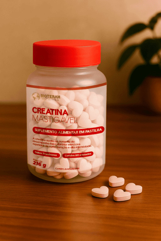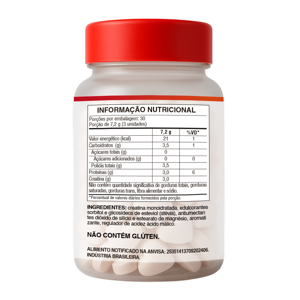 Suplemento de creatina mastigável sabor framboesa, com 3g por dose. Mais desempenho e força em cada treino. Sem açúcar, sem glúten, com praticidade e sabor.